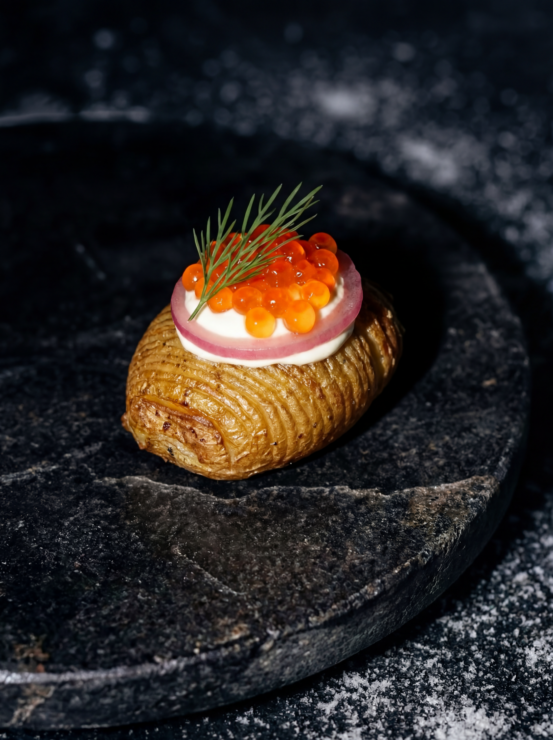 Hasselback kartupeļi ar foreles ikriem un pikantu sīpolu